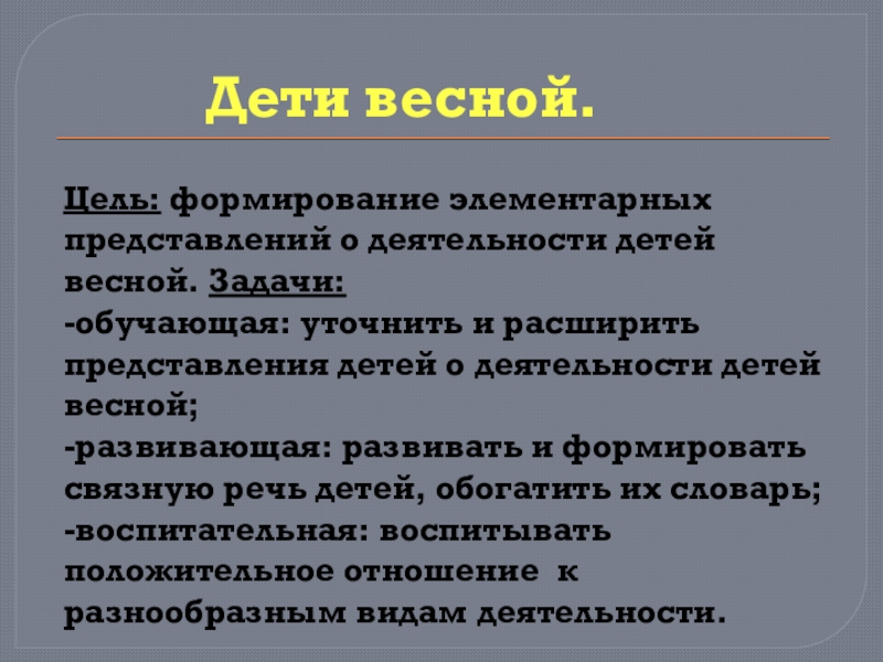 -обучающая: уточнить и расширить представления детей о деятельности детей весной;