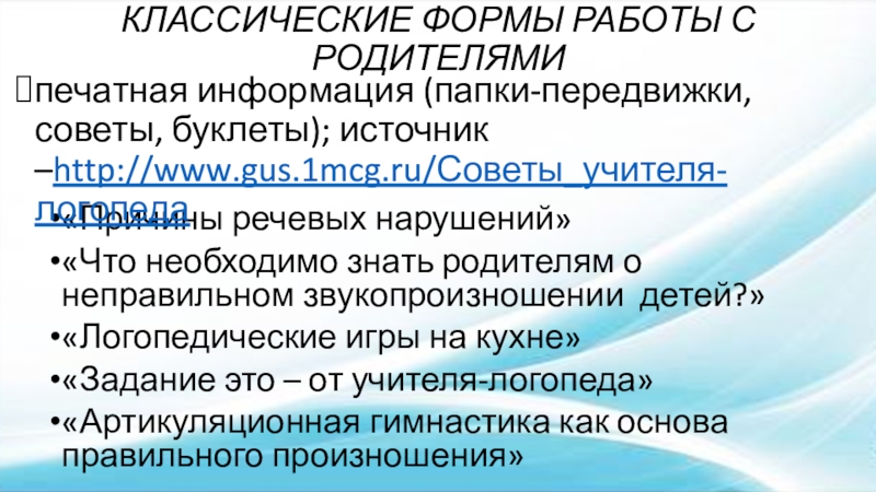 печатная информация (папки-передвижки, советы, буклеты); источник –http://www.gus.1mcg.ru/Советы_учителя-логопеда