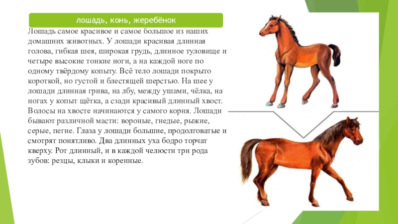 лошади красивая длинная голова, гибкая шея, широкая грудь, длинное туловище и четыре высокие тонкие ноги, а на каждой ноге по одному твёрдому копыту. Всё тело лошади покрыто короткой, но густой и блестящей шерстью. На шее у лошади длинная грива, на лбу, между ушами, чёлка, на ногах у копыт щётка, а сзади красивый длинный хвост. Волосы на хвосте начинаются у самого корня. Лошади бывают различной масти: вороные, гнедые, рыжие, серые, пегие. Глаза у лошади большие, продолговатые и смотрят понятливо. Два длинных уха бодро торчат кверху. Рот длинный, и в каждой челюсти три рода зубов: резцы, клыки и коренные.