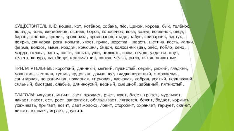 ГЛАГОЛЫ: мяукает, мычит, лает, хрюкает, ржет, жует, блеет, грызет, мурлычет, лакает, пасет, ест, роет, запрягают, обгладывает, лягается, бежит, бодает, кормить, ухаживать, прыгает, возит, дает молоко, ловит, сторожит, охраняет, гарцует, скачет, лижет, тяфкает, играет, дружить.