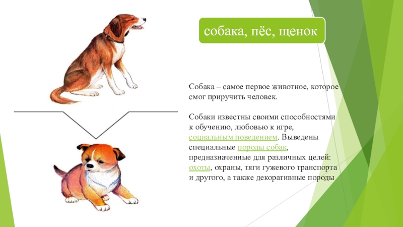 способностями к обучению, любовью к игре, социальным поведением. Выведены специальные породы собак, предназначенные для различных целей: охоты, охраны, тяги гужевого транспорта и другого, а также декоративные породы