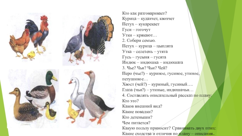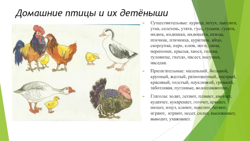 Глаголы: ходят, летают, плавает, квохчет, кудахчет, кукарекает, гогочет, крякает, пищит, ищут, клюют, щиплют, бегают, играют, играют, несет, сидит, высиживает, выводит, ухаживает.