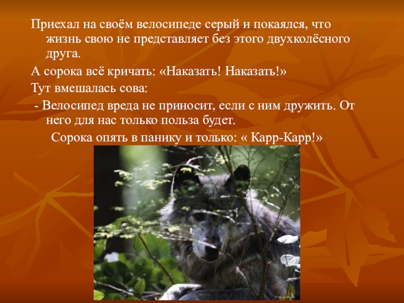 Слайд 12Приехал на своём велосипеде серый и покаялся, что жизнь свою не