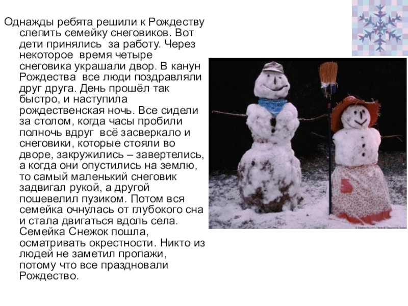 за работу. Через некоторое время четыре снеговика украшали двор. В канун Рождества все люди поздравляли друг друга. День прошёл так быстро, и наступила рождественская ночь. Все сидели за столом, когда часы пробили полночь вдруг всё засверкало и снеговики, которые стояли во дворе, закружились – завертелись, а когда они опустились на землю, то самый маленький снеговик задвигал рукой, а другой пошевелил пузиком. Потом вся семейка очнулась от глубокого сна и стала двигаться вдоль села. Семейка Снежок пошла, осматривать окрестности. Никто из людей не заметил пропажи, потому что все праздновали Рождество.