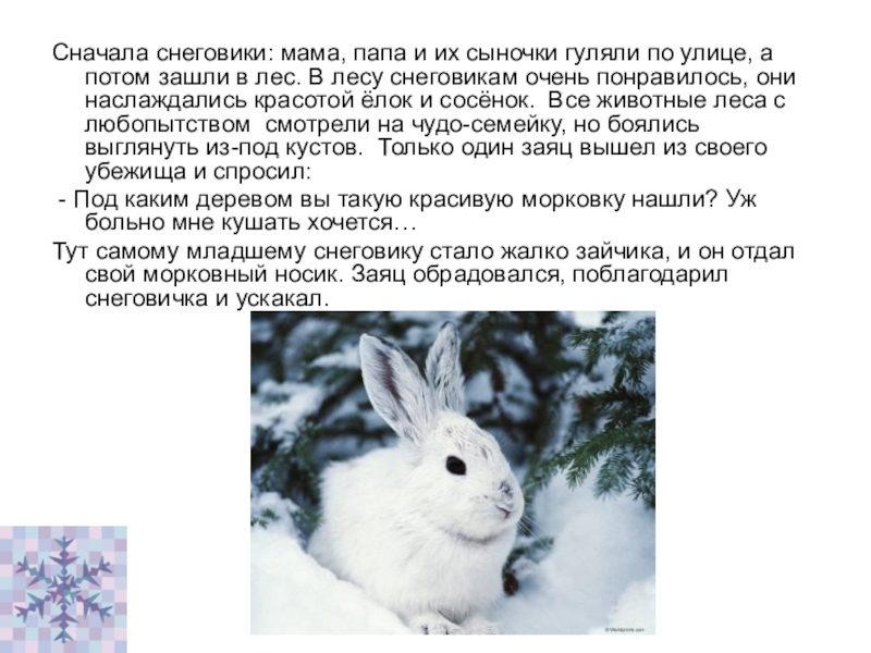 потом зашли в лес. В лесу снеговикам очень понравилось, они наслаждались красотой ёлок и сосёнок. Все животные леса с любопытством смотрели на чудо-семейку, но боялись выглянуть из-под кустов. Только один заяц вышел из своего убежища и спросил: