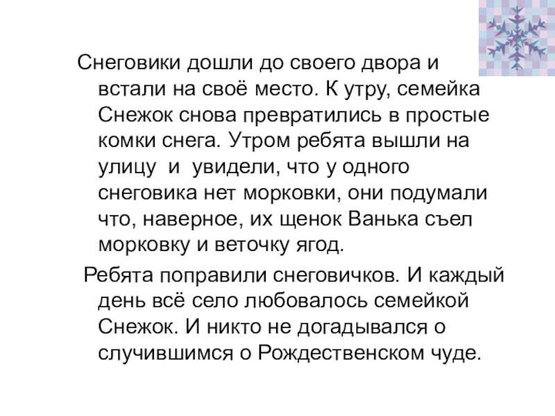 Ребята поправили снеговичков. И каждый день всё село любовалось семейкой Снежок. И никто не догадывался о случившимся о Рождественском чуде.