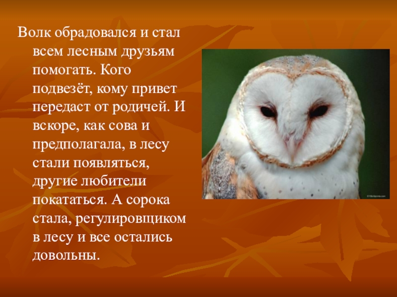 Слайд 14Волк обрадовался и стал всем лесным друзьям помогать. Кого подвезёт, кому
