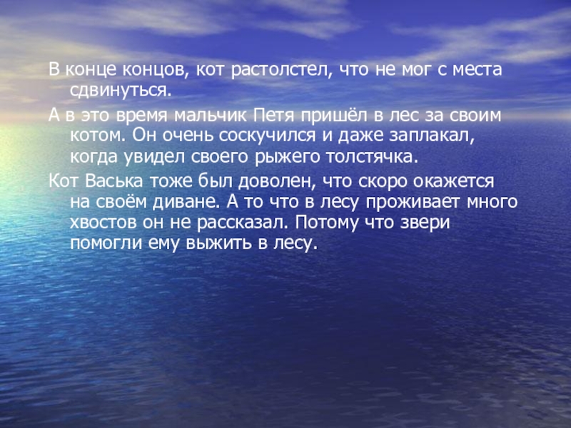 в это время мальчик Петя пришёл в лес за своим котом. Он очень соскучился и даже заплакал, когда увидел своего рыжего толстячка.