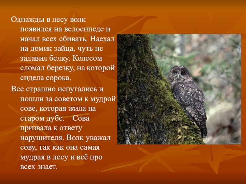 Все страшно испугались и пошли за советом к мудрой сове, которая жила на старом дубе. Сова призвала к ответу нарушителя. Волк уважал сову, так как она самая мудрая в лесу и всё про всех знает.