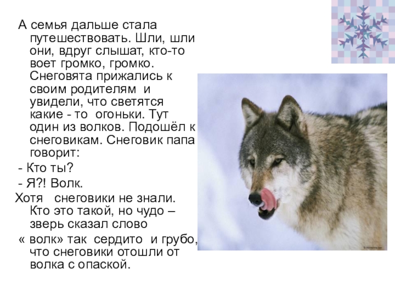 кто-то воет громко, громко. Снеговята прижались к своим родителям и увидели, что светятся какие - то огоньки. Тут один из волков. Подошёл к снеговикам. Снеговик папа говорит: