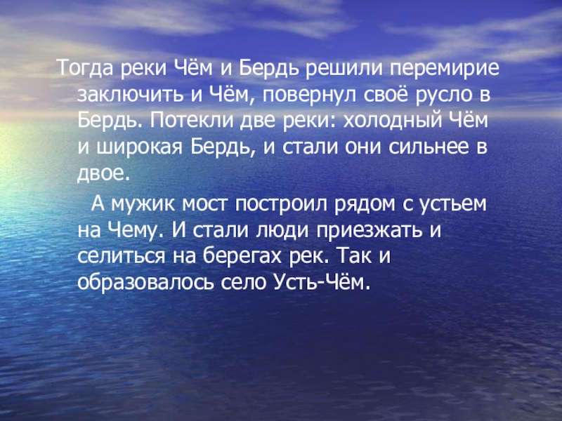 Слайд 9Тогда реки Чём и Бердь решили перемирие заключить и Чём, повернул