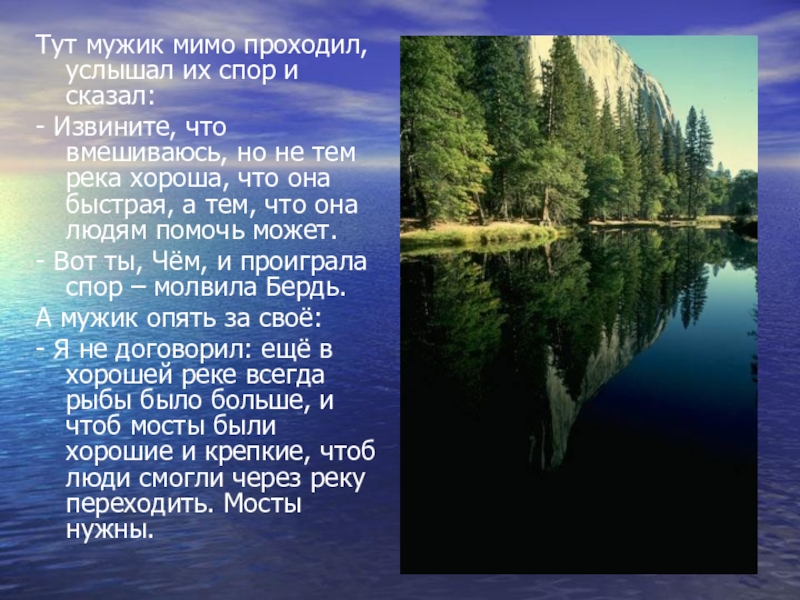 - Я не договорил: ещё в хорошей реке всегда рыбы было больше, и чтоб мосты были хорошие и крепкие, чтоб люди смогли через реку переходить. Мосты нужны.