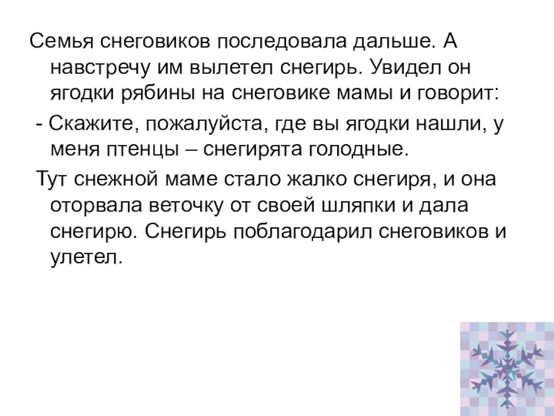 Тут снежной маме стало жалко снегиря, и она оторвала веточку от своей шляпки и дала снегирю. Снегирь поблагодарил снеговиков и улетел.