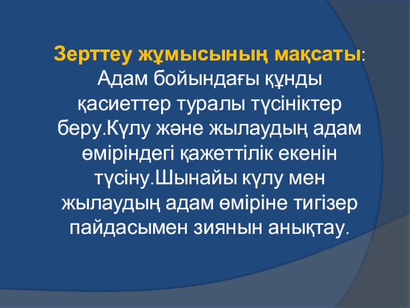 Слайд 2Зерттеу жұмысының мақсаты: Адам бойындағы құнды қасиеттер туралы түсініктер беру.Күлу және жылаудың