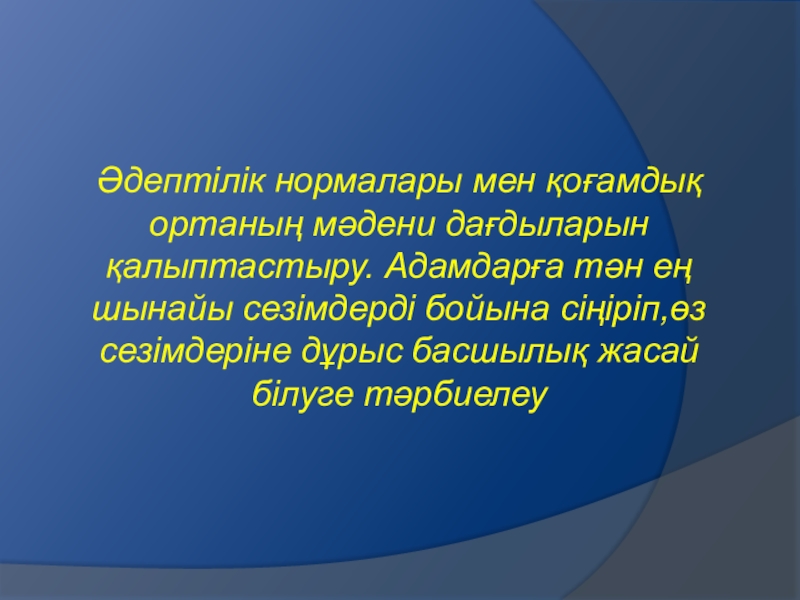 Слайд 3Әдептілік нормалары мен қоғамдық ортаның мәдени дағдыларын қалыптастыру. Адамдарға тән ең