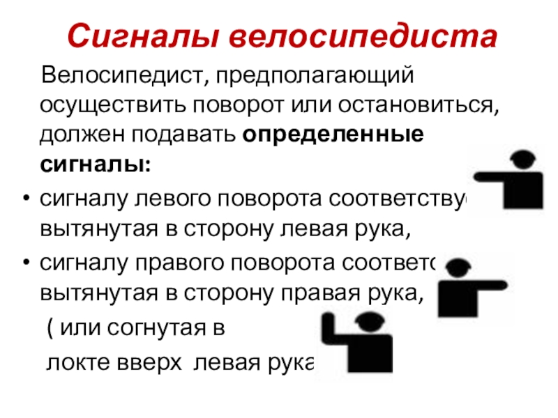 Велосипедист, предполагающий осуществить поворот или остановиться, должен подавать