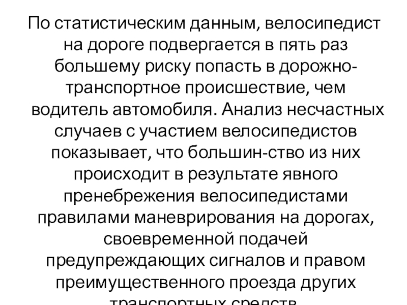 раз большему риску попасть в дорожно-транспортное происшествие, чем водитель автомобиля. Анализ несчастных случаев с участием велосипедистов показывает, что большин-ство из них происходит в результате явного пренебрежения велосипедистами правилами маневрирования на дорогах, своевременной подачей предупреждающих сигналов и правом преимущественного проезда других транспортных средств.