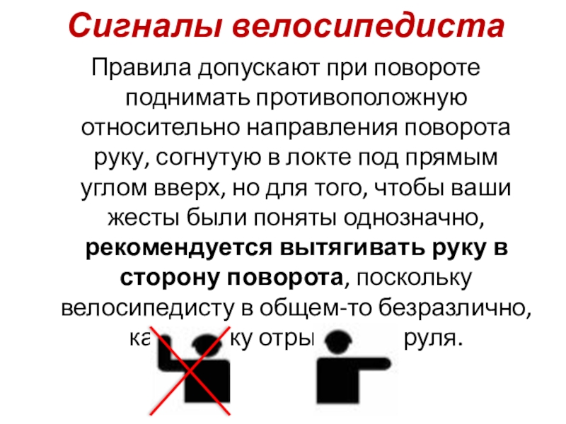 согнутую в локте под прямым углом вверх, но для того, чтобы ваши жесты были поняты однозначно, рекомендуется вытягивать руку в сторону поворота, поскольку велосипедисту в общем-то безразлично, какую руку отрывать от руля.