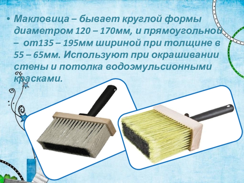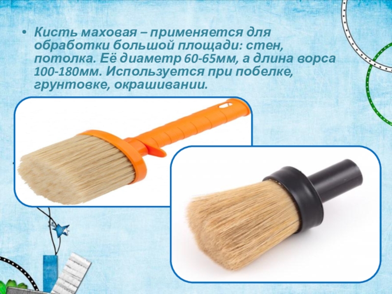 Слайд 4Кисть маховая – применяется для обработки большой площади: стен, потолка. Её