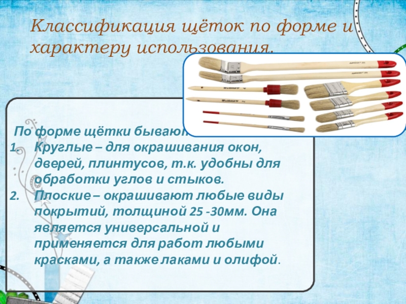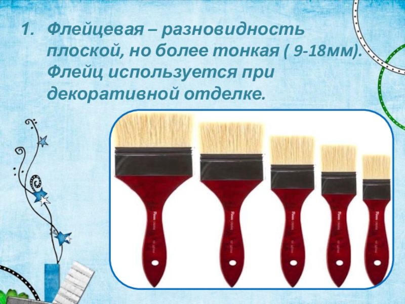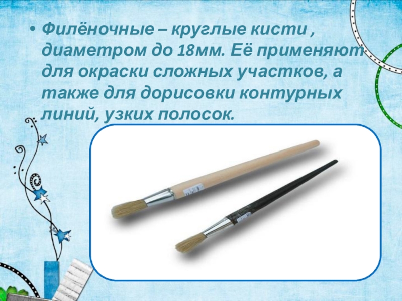 Слайд 9Филёночные – круглые кисти , диаметром до 18мм. Её применяют для