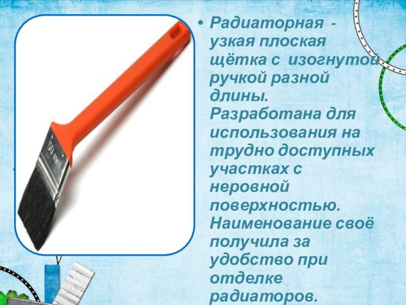 Слайд 7Радиаторная - узкая плоская щётка с изогнутой ручкой разной длины. Разработана