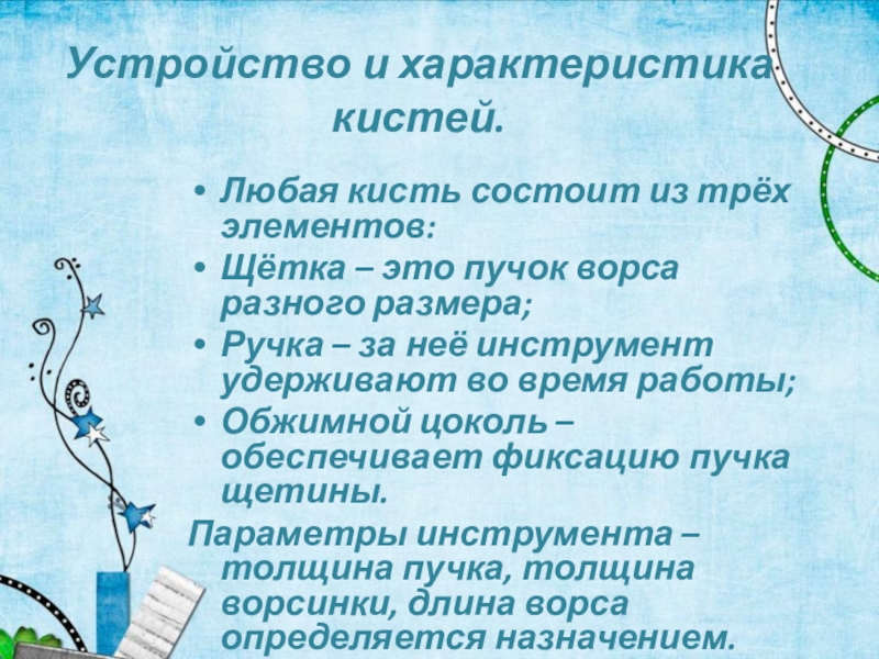 Параметры инструмента – толщина пучка, толщина ворсинки, длина ворса определяется назначением.
