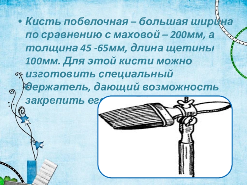 Слайд 5Кисть побелочная – большая ширина по сравнению с маховой – 200мм,