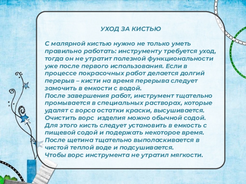 инструменту требуется уход, тогда он не утратит полезной функциональности уже после первого использования. Если в процессе покрасочных работ делается долгий перерыв – кисти на время перерыва следует замочить в емкости с водой.