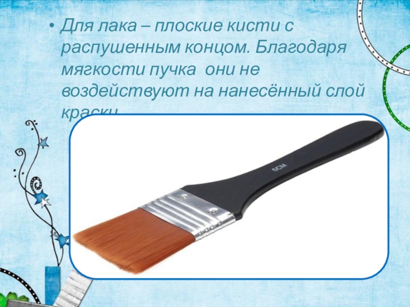 Слайд 8Для лака – плоские кисти с распушенным концом. Благодаря мягкости пучка