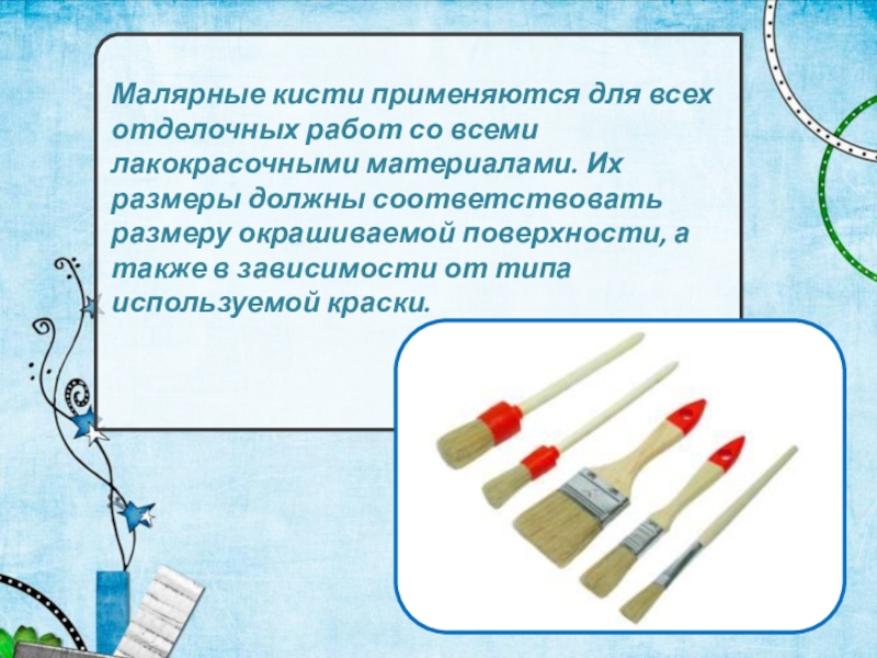Слайд 2Малярные кисти применяются для всех отделочных работ со всеми лакокрасочными материалами.