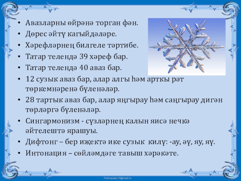 Авазларны өйрәнә торган фән.Дөрес әйтү кагыйдәләре.Хәрефләрнең билгеле тәртибе.Татар телендә 39 хәреф бар.Татар телендә 40 аваз бар.12 сузык