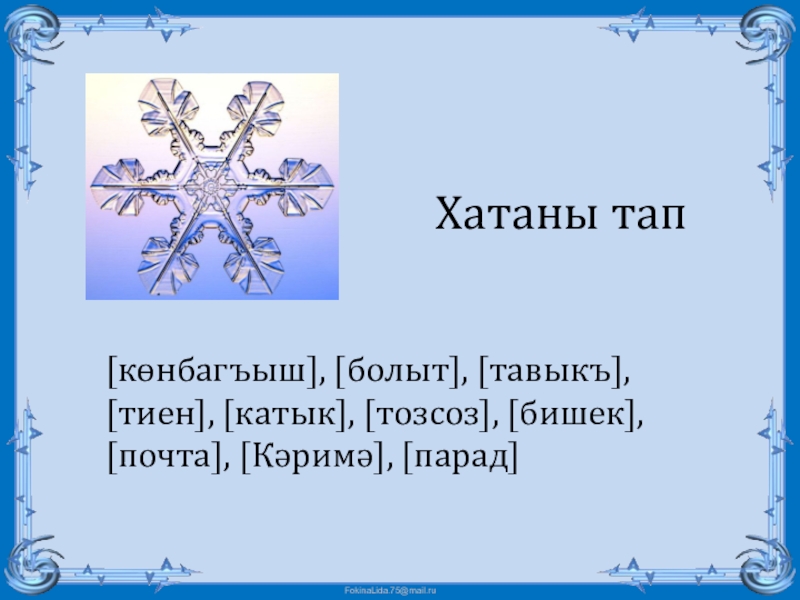 Хатаны тап[көнбагъыш], [болыт], [тавыкъ], [тиен], [катык], [тозсоз], [бишек], [почта], [Кәримә], [парад]
