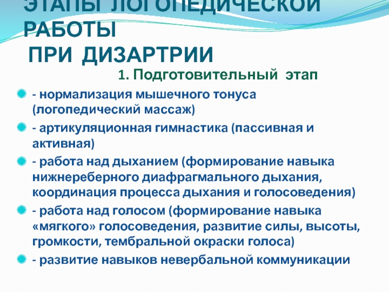 — определяются характером и степенью выраженности проявлений артикуляционных, дыхательных и голосовых расстройств;