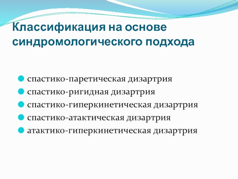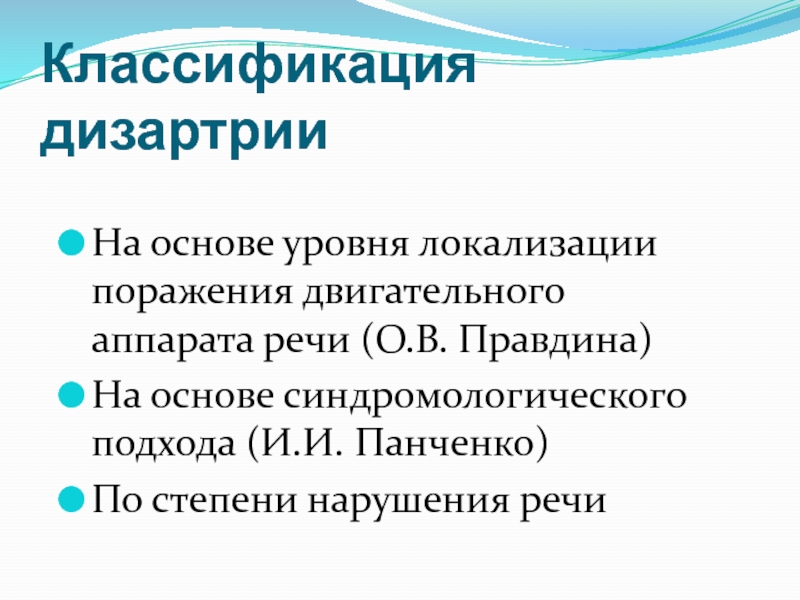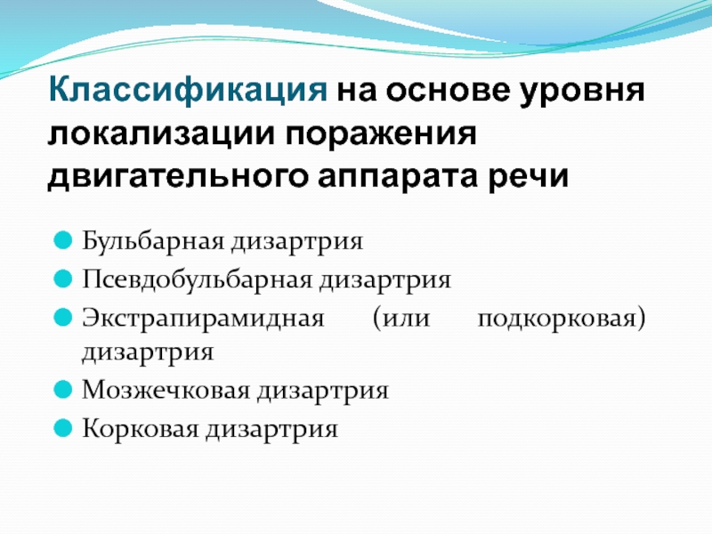 Слайд 11Классификация на основе уровня локализации поражения двигательного аппарата речи