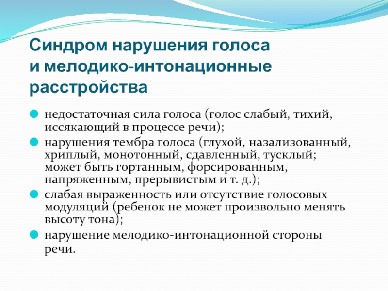 нарушения тембра голоса (глухой, назализованный, хриплый, монотонный, сдавленный, тусклый; может быть гортанным, форсированным, напряженным, прерывистым и т. д.);