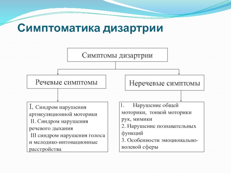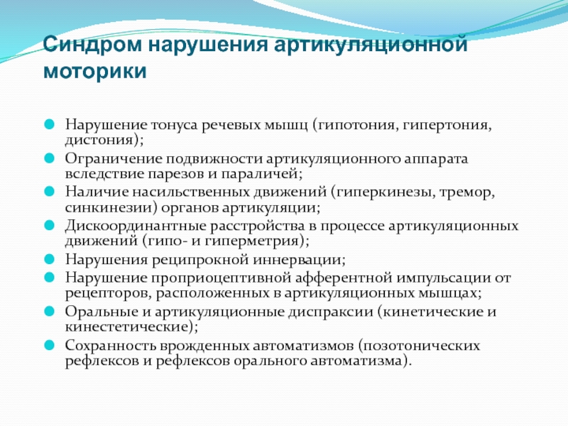 речевые симптомы: стойкие дефекты произношения, недостаточность произвольных артикуляционных движений, голосовых реакций, неправильное положение языка в полости рта, его насильственные движения, нарушения голосообразования и речевого дыхания, задержанное развитие речи.