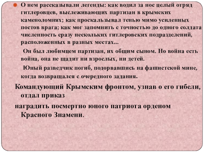 Слайд 14О нем рассказывали легенды: как водил за нос целый отряд гитлеровцев, выслеживающих партизан