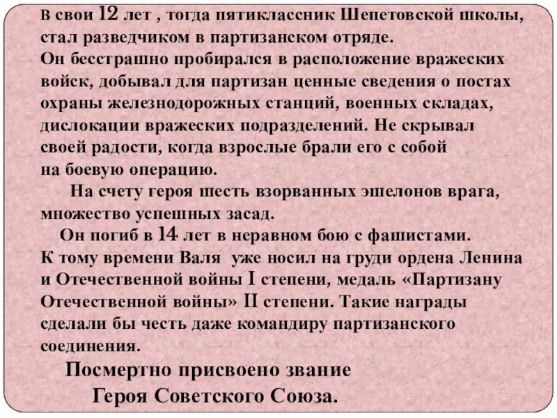 Слайд 8В свои 12 лет , тогда пятиклассник Шепетовской школы, стал разведчиком в партизанском отряде.