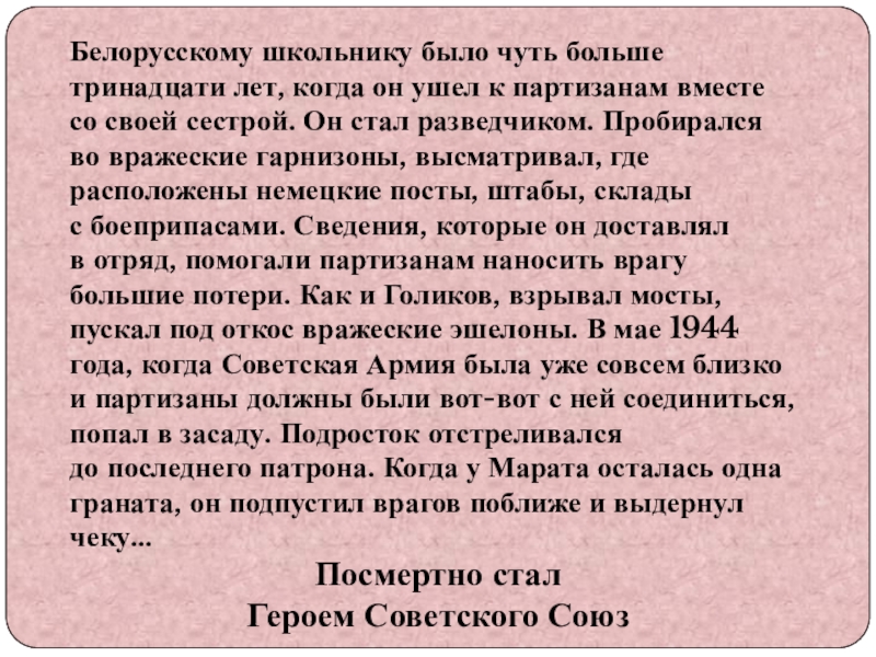 Слайд 6Белорусскому школьнику было чуть больше тринадцати лет, когда он ушел к партизанам вместе
