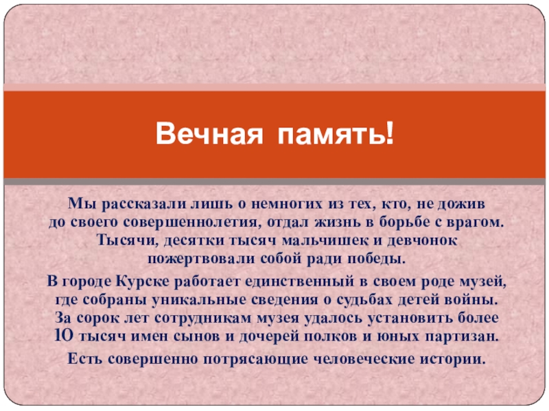 Слайд 17Мы рассказали лишь о немногих из тех, кто, не дожив до своего совершеннолетия, отдал жизнь в борьбе