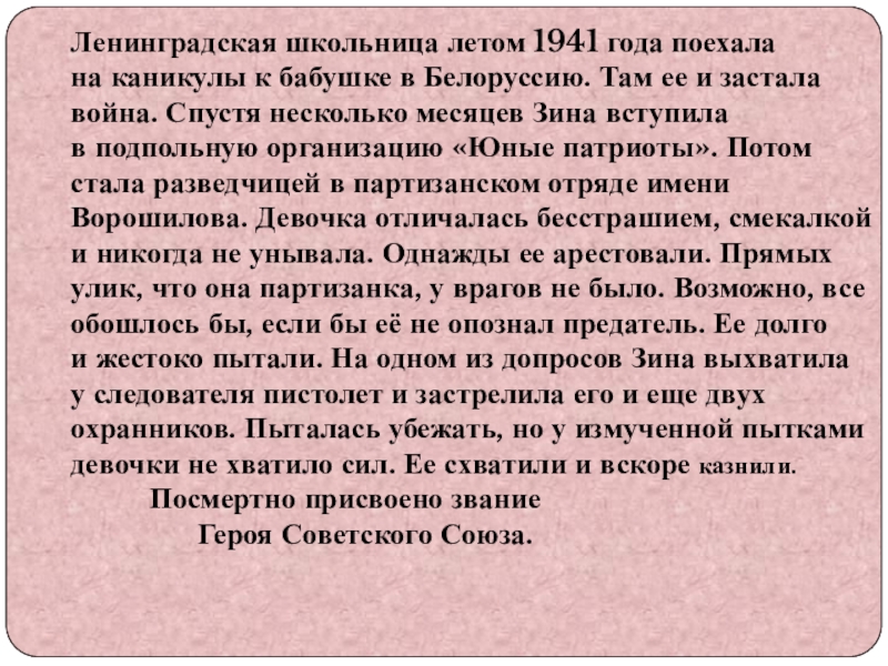 застала война. Спустя несколько месяцев Зина вступила в подпольную организацию «Юные патриоты». Потом стала разведчицей в партизанском отряде имени Ворошилова. Девочка отличалась бесстрашием, смекалкой и никогда не унывала. Однажды ее арестовали. Прямых улик, что она партизанка, у врагов не было. Возможно, все обошлось бы, если бы её не опознал предатель. Ее долго и жестоко пытали. На одном из допросов Зина выхватила у следователя пистолет и застрелила его и еще двух охранников. Пыталась убежать, но у измученной пытками девочки не хватило сил. Ее схватили и вскоре казнили.