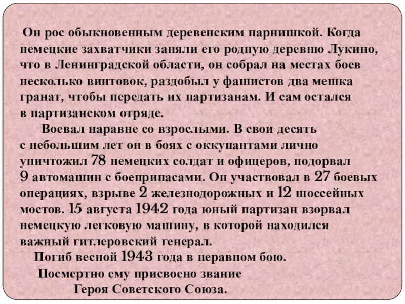 Слайд 4 Он рос обыкновенным деревенским парнишкой. Когда немецкие захватчики заняли его родную