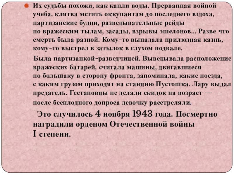 Слайд 12Их судьбы похожи, как капли воды. Прерванная войной учеба, клятва мстить оккупантам