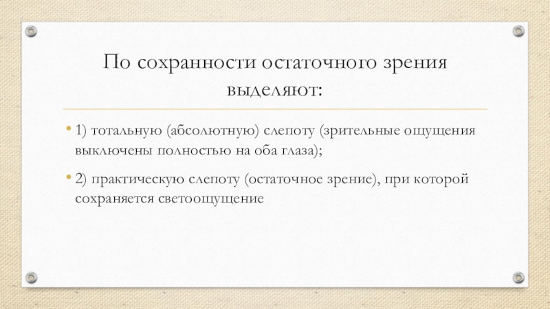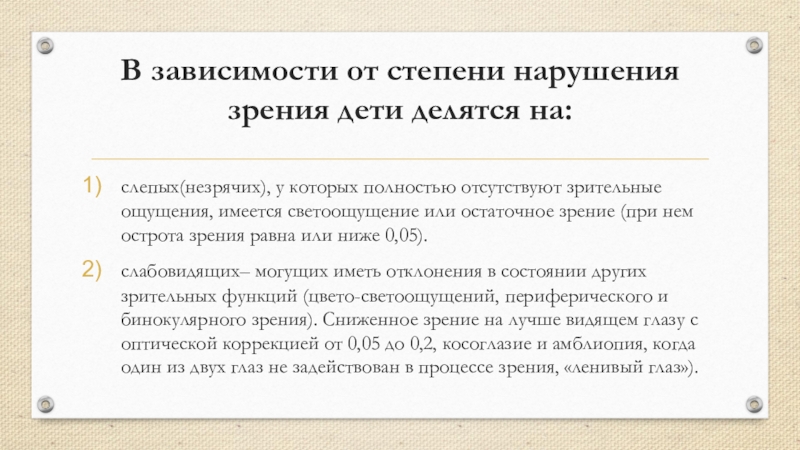 Слайд 7В зависимости от степени нарушения зрения дети делятся на: