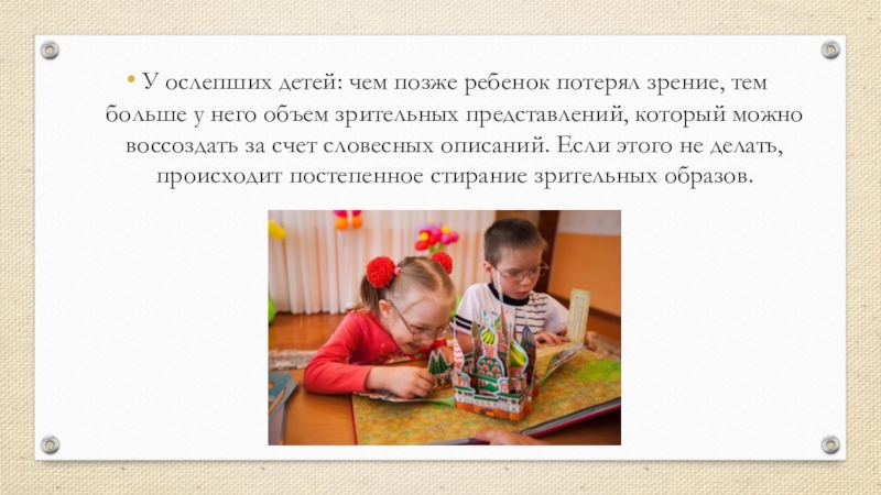 Слайд 14У ослепших детей: чем позже ребенок потерял зрение, тем больше у