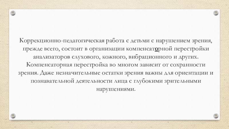 организации компенсаторной перестройки анализаторов слухового, кожного, вибрационного и других. Компенсаторная перестройка во многом зависит от сохранности зрения. Даже незначительные остатки зрения важны для ориентации и познавательной деятельности лица с глубокими зрительными нарушениями.