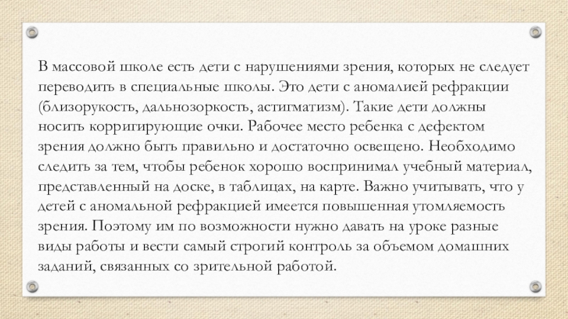 переводить в специальные школы. Это дети с аномалией рефракции (близорукость, дальнозоркость, астигматизм). Такие дети должны носить корригирующие очки. Рабочее место ребенка с дефектом зрения должно быть правильно и достаточно освещено. Необходимо следить за тем, чтобы ребенок хорошо воспринимал учебный материал, представленный на доске, в таблицах, на карте. Важно учитывать, что у детей с аномальной рефракцией имеется повышенная утомляемость зрения. Поэтому им по возможности нужно давать на уроке разные виды работы и вести самый строгий контроль за объемом домашних заданий, связанных со зрительной работой.