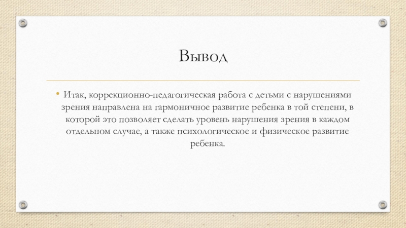 Итак, коррекционно-педагогическая работа с детьми с нарушениями зрения направлена на гармоничное