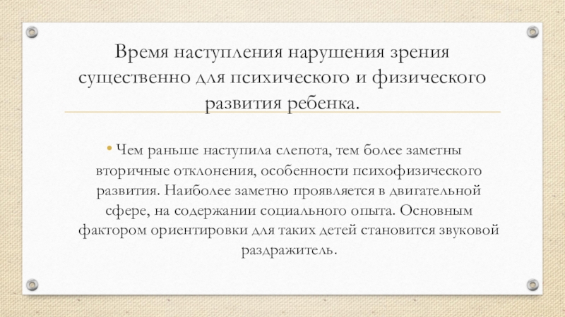 Слайд 12Время наступления нарушения зрения существенно для психического и физического развития ребенка.