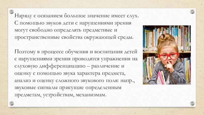 Поэтому в процессе обучения и воспитания детей с нарушениями зрения проводятся упражнения на слуховую дифференциацию – различение и оценку с помощью звука характера предмета, анализ и оценку сложного звукового поля: напр., звуковые сигналы присущие определенным предметам, устройствам, механизмам.